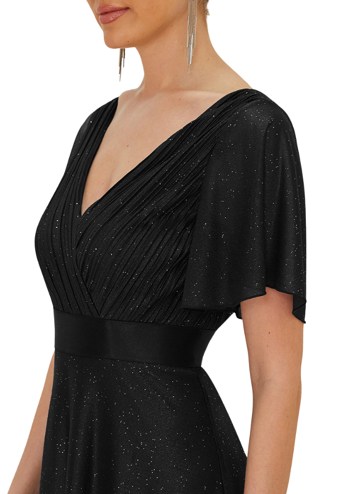 Bell sleeves. V neck. Ruched bodice. Padded. Lined. Back center zip. Polyester. Plus size available. Navy or Black